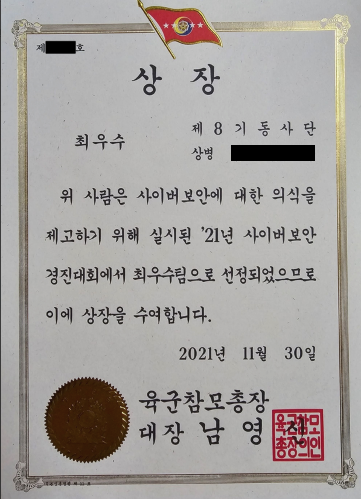 참모총장상을 받게 되면서 휴가도 5일이나 받게 되었다. 진정한 키보드 워리어가 되었다. CTF 대회 수상해본 적이 없었는데 육군만 경쟁하는 대회라도 나에겐 첫 CTF 수상이어서 정말 뜻깊은 상이다. 해커톤을 같이하는 것을 이해해주고 이끌어준 팀원에게 정말 고맙다는 말을 다시 전한다. 팀원 덕분에 수상할 수 있었다.