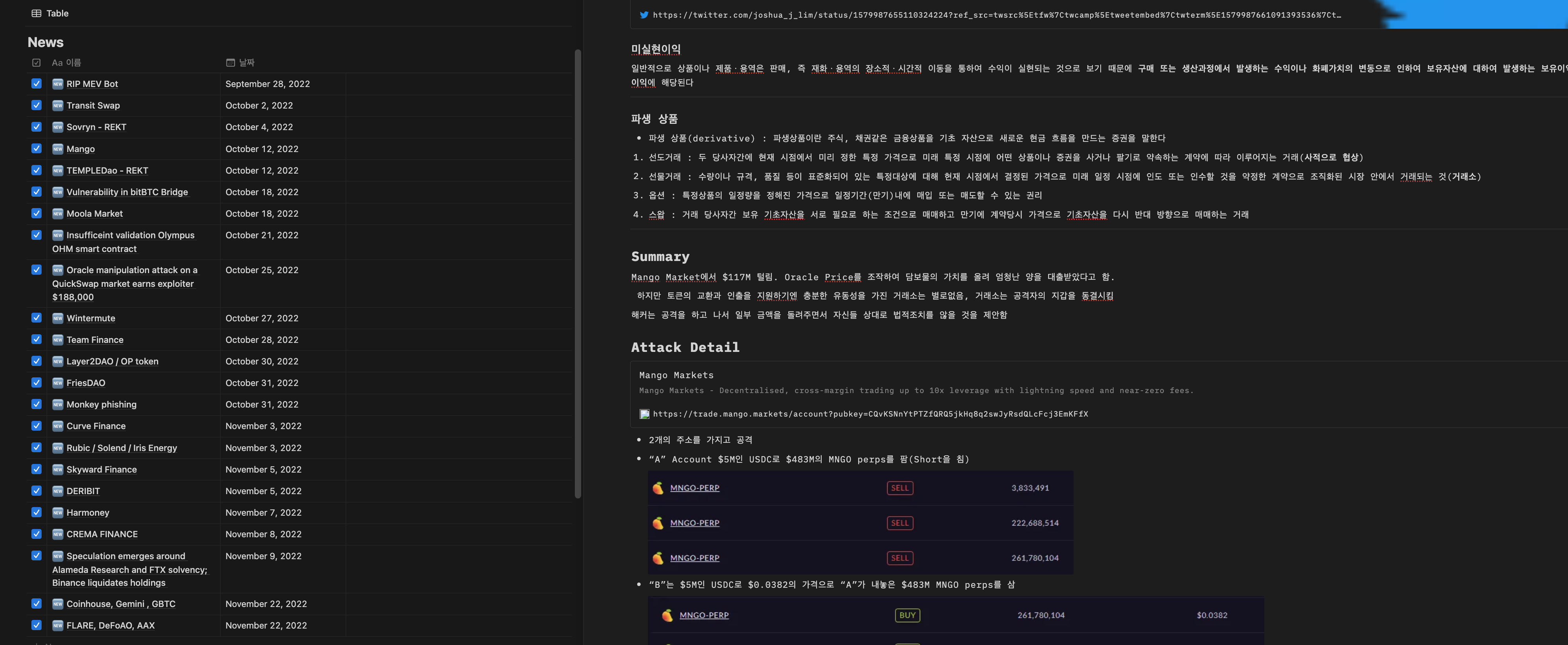 나의 최종 프로젝트는 Maker DAO와 비슷한 특정 기업의 과담보 스테이블 코인에 대한 취약점 분석이었다. 초반에는 유명한/최신 해킹 사건에 관련해서 리서치를 하고 공유하는 방식으로 취약점 인사이트를 넓혔다.