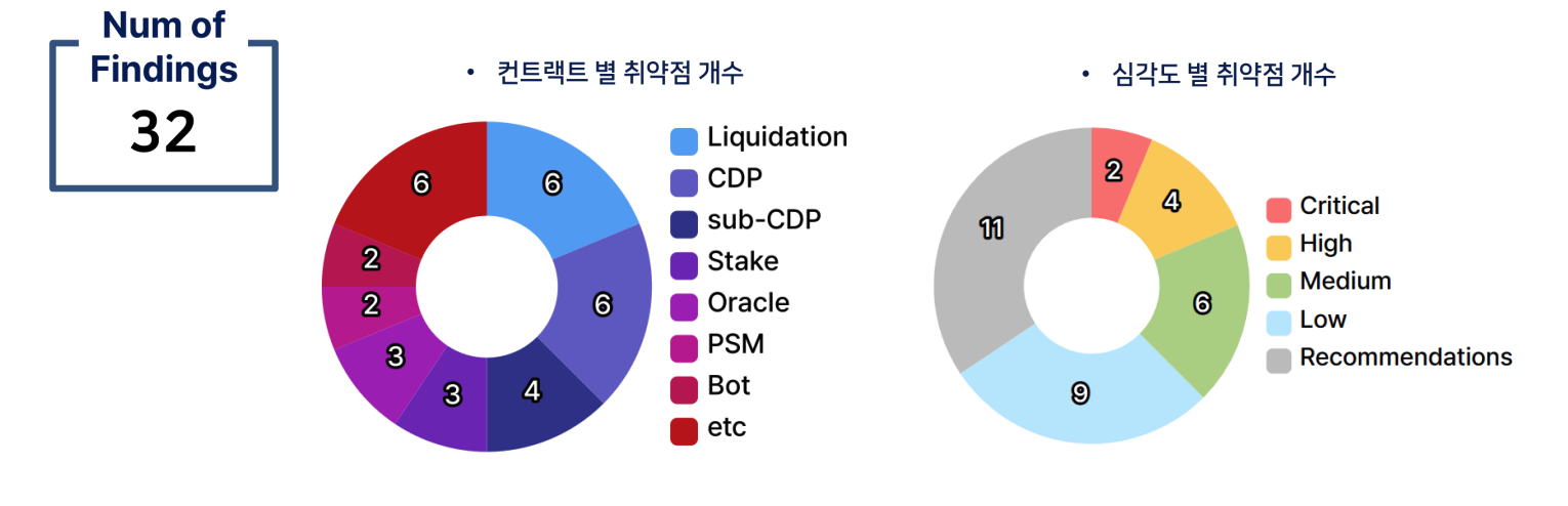 우리 팀은 총 32개의 취약점을 발견했다. DeFi 프로젝트인 만큼 계산 및 로직 흐름 문제가 많았다.