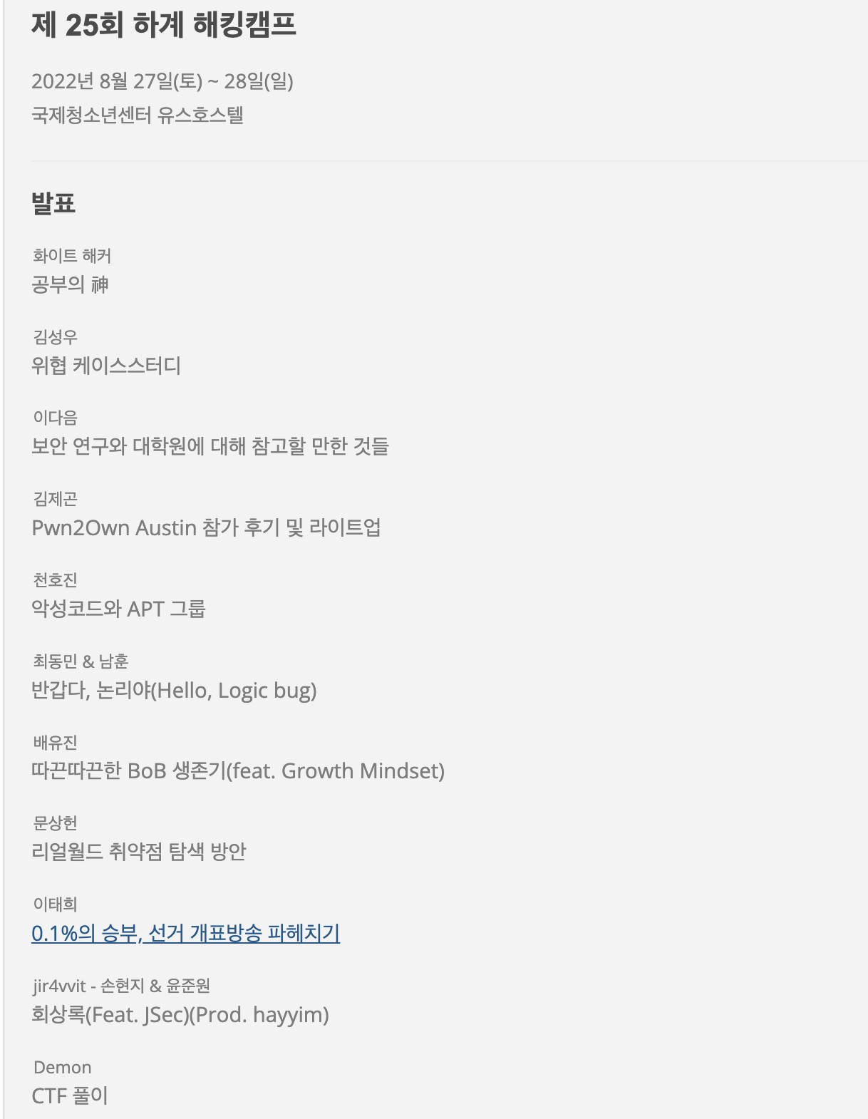 다양한 분들이 나와서 발표를 진행했다. 제일 기억에 남는 발표는 내가 악성코드, 리버싱, 버그 바운티에 관심이 많아서 그런지 “악성코드와 APT 그룹”과 “리얼월드 취약점 탐색 방안” 발표가 가장 기억에 남는다. 나머지 발표도 재밌게 들었는데 아직 실력이 부족해서 그런지 이해되지 않는 부분도 많았다.