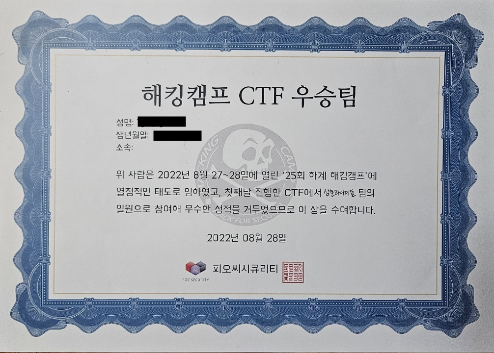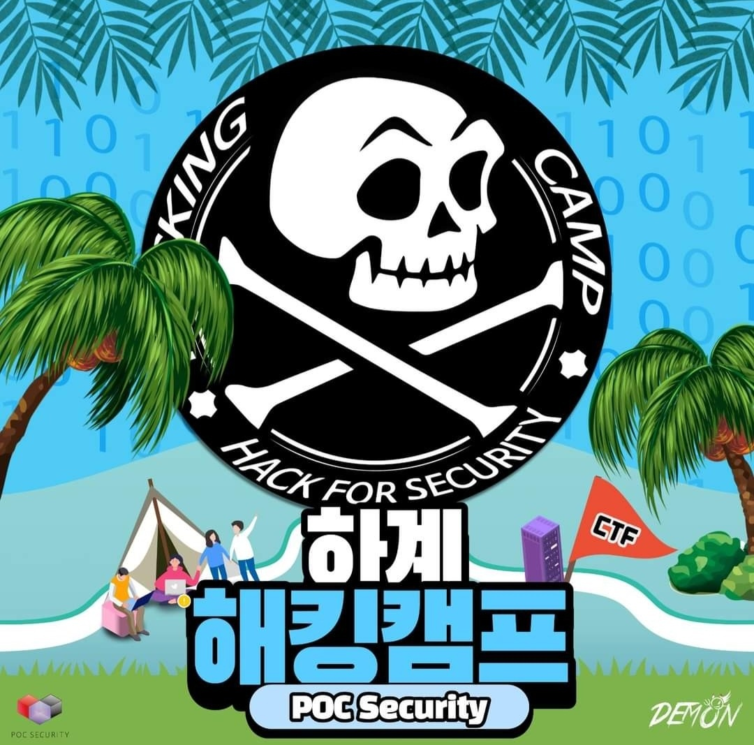 2022년 8월 군대를 전역한 후 나는 동기와 함께 해킹캠프를 지원했다. 해킹캠프는 POC에서 주관하는 해킹·보안 캠프이다. 제25회 하계 해킹캠프는 국제 청소년 유스호스텔에서 진행되었다. 캠프는 1박 2일로 진행되며 다양한 발표와 CTF가 진행되었다.