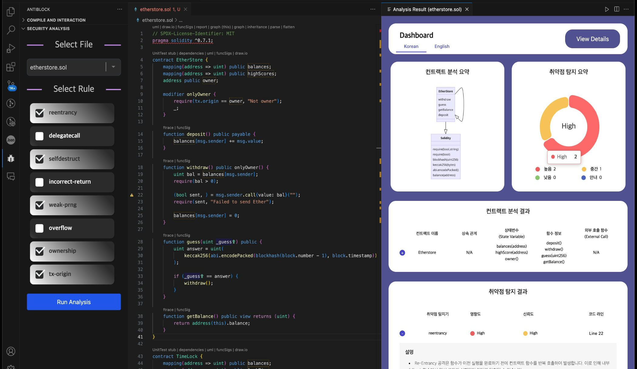 정적 분석 도구는 Slither를 사용했다. Slither에서 제공하는 분석 룰을 선택할 수 있으며 분석 후 Webview를 통해 결과를 보여주도록 하였다.