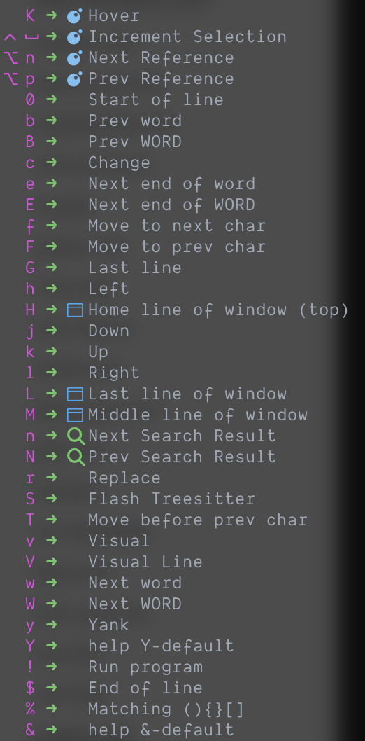 위의 키맵 말고도 Lazyvim에서 제공하는 키맵이 있다. 또한 vim의 cmdline에 WhichKey를 입력하면 키에 대한 테이블을 볼 수 있다.