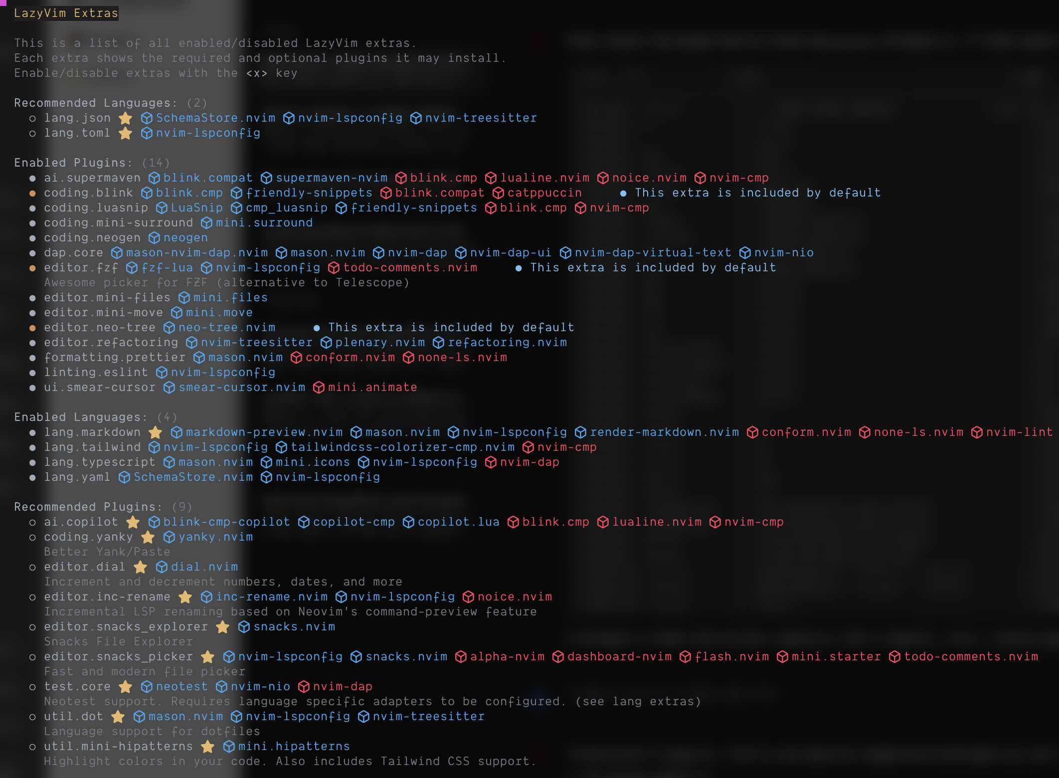 Lazyvim은 LazyExtra 명령어를 통해서 플러그인을 쉽게 다운로드 받을 수 있다. 다운로드하고 싶은 플러그인에 커서를 두고 x를 누르면 설치할 수 있다.
